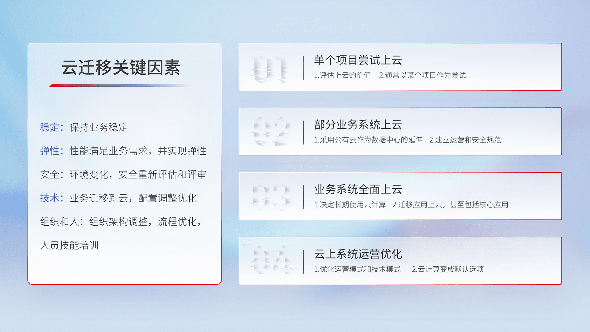 结合实际业务,,,从规划设计、、云平台选型、、云原生改造、、、数据迁移、、、集成交付,,迁移全过程为客户识别最佳上云路径,,,,做好风险识别管理,,,,设计网络架构、、身份权限、、、安全审计合规、、操作审计、、日志审计、、监控告警策略、、、多站点容灾设计等,,,对云上基础设施进行整体规划,,,,提升IT治理水平,,,,以满足弹性、、、、高可用、、、高性能的需求。。