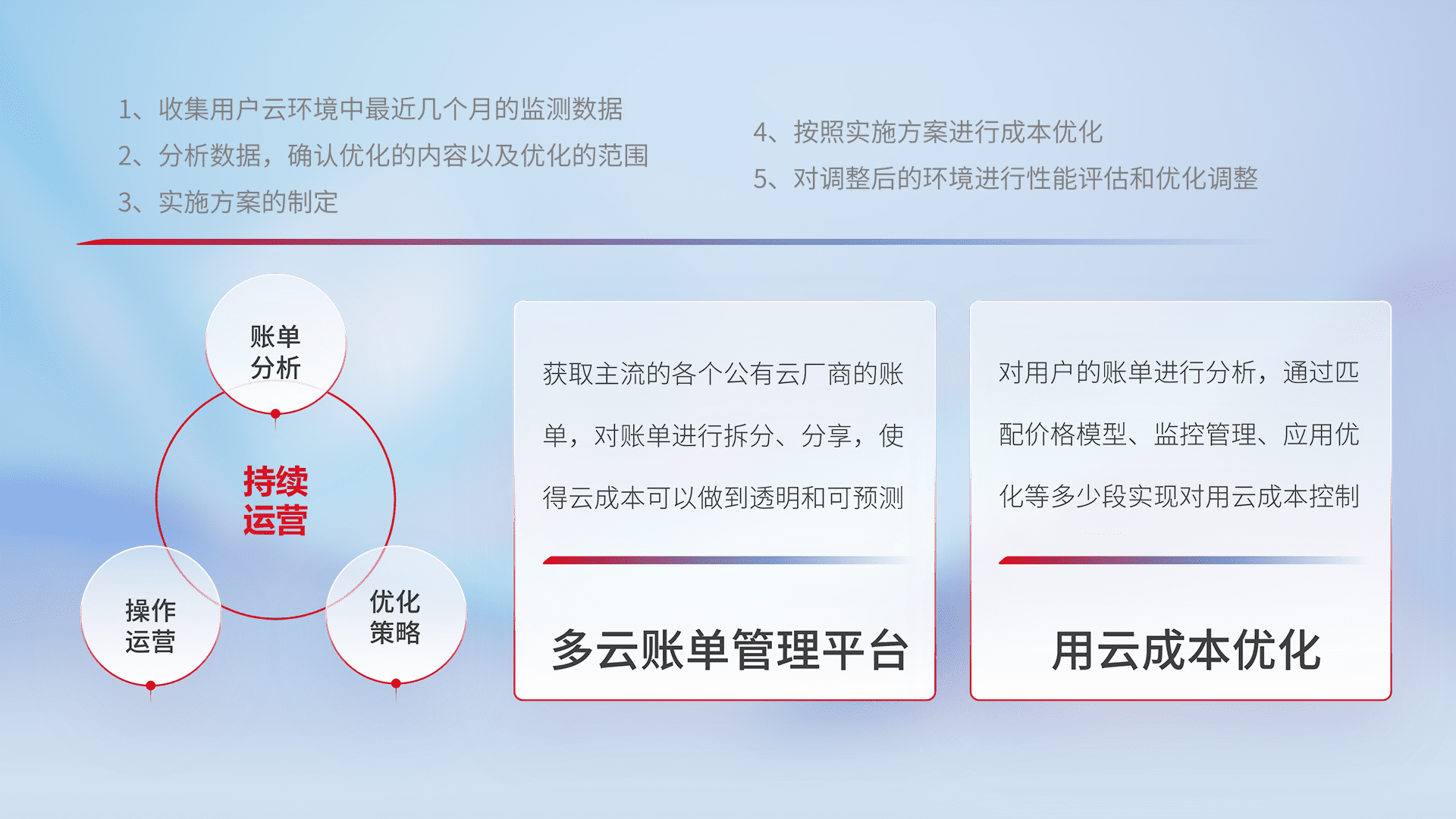 通过多云纳管,,以统一的资源数据模型把客户的云资源进行抽象和封装,,,,进而实现对多云资源的统一操作,,,保障云资源管理的可靠性、、、稳定性与可用性。。量身定制化运维内容,,,,配置、、、开发运维、、、、补丁管理、、备份、、监控、、认证和访问管理、、、、审计和日常巡检等,,,,保障在用云过程中的可靠度,,,稳定度以及高可用率。。