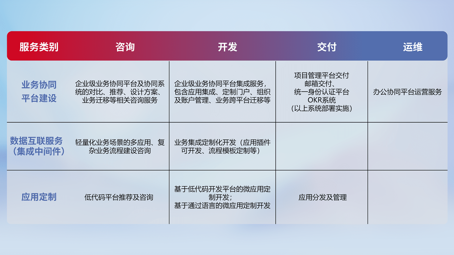 针对钉钉、、企微、、、IDaas等平台级产品提供产品的规划、、、、方案、、交付、、、定制化开发等服务,,,实现如统一协同办公、、智能客户服务、、、混合会议管理、、、、智能数据查询、、、等业务场景,,实现数字化转型。。